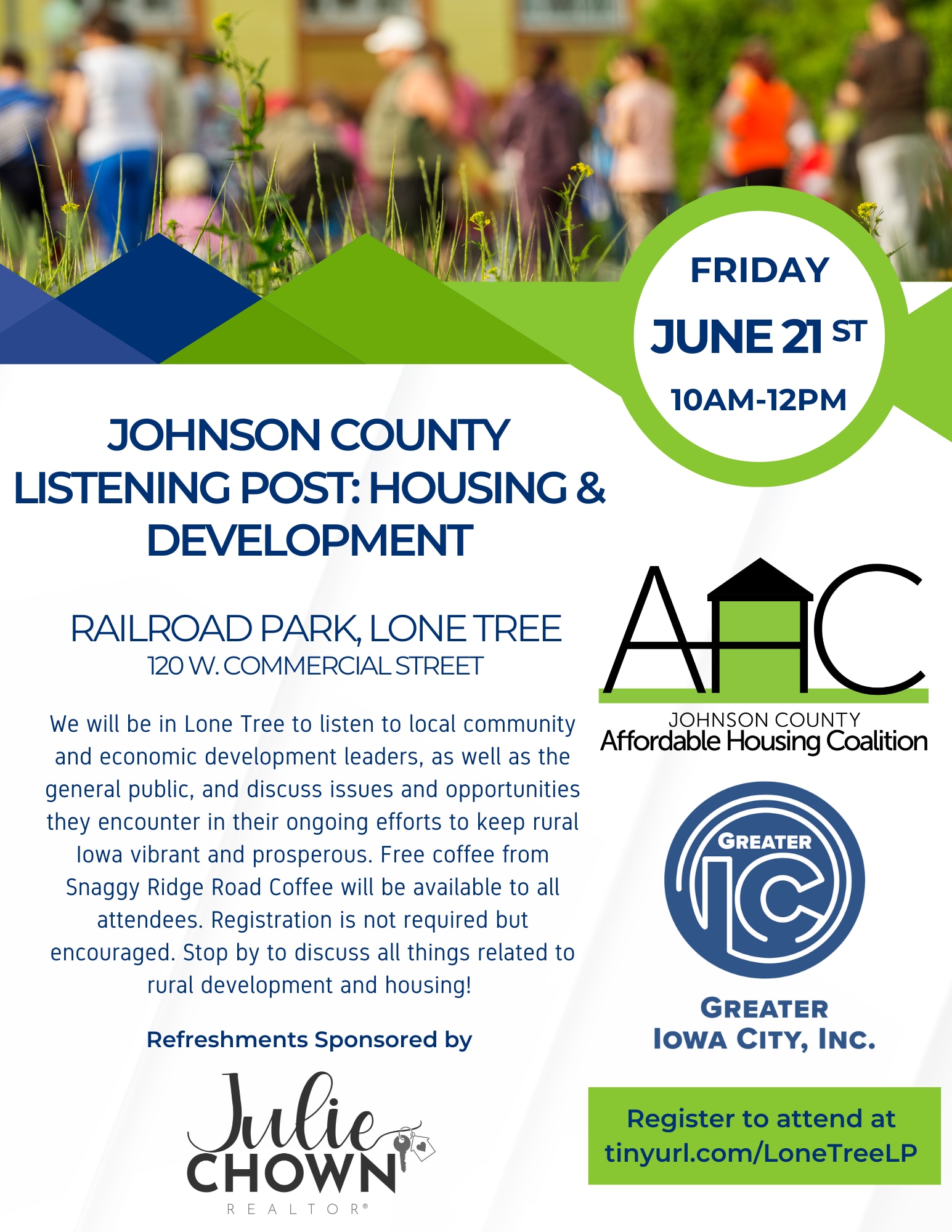 Greater Iowa City, Inc. (Greater IC) and Johnson County Affordable Housing Coalition are launching a Listening Posts Series in rural communities. Spearheaded by Sarah Thompson of Greater IC and Jessica Andino of Johnson County Affordable Housing Coalition, the series creates spaces to engage in meaningful dialogue about the future of rural development and housing in Johnson County.