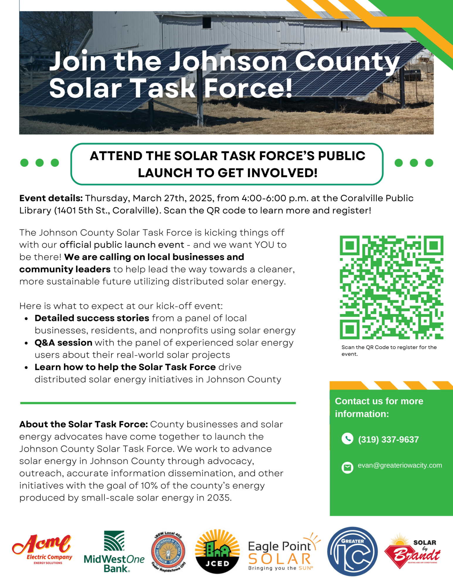 The Solar Task Force’s first public meeting will be held on Thursday, March 27, 2025 from 4:00 to 6:00 PM at the Coralville Public Library, 1401 Fifth Street, Coralville. This event is free to attend. However, registration for this event is requested, but not required.