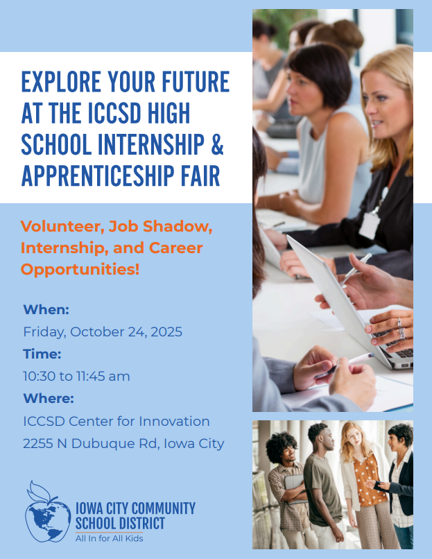 You're invited to ICCSD's High School Internship & Apprenticeship Fair on Friday, October 24, 2025, from 10:30–11:45 a.m. at the ICCSD Center for Innovation. This event connects students with local organizations offering volunteer opportunities, job shadows, internships, and career pathways. Employers and community partners are invited to host a table and engage with the next generation of talent.