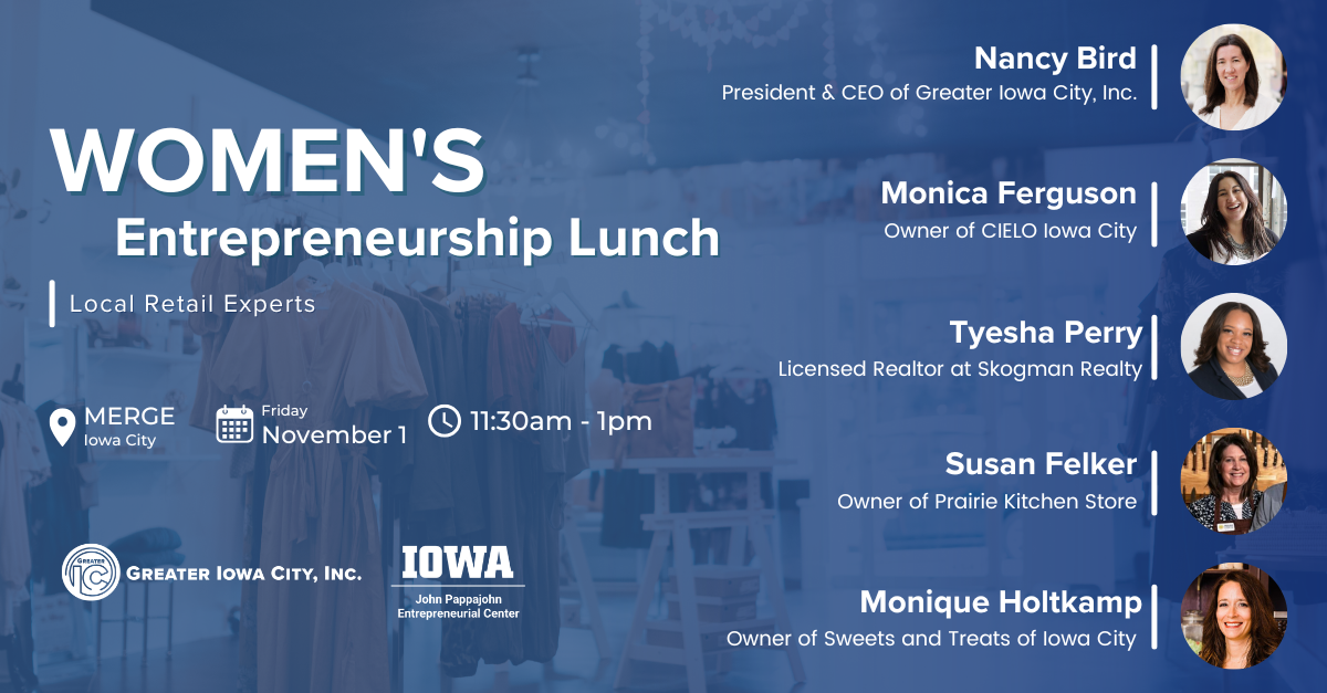 Join Greater Iowa City, Inc. and the University of Iowa's John Pappajohn Entrepreneurial Center to connect with women in business, enjoy lunch, and learn from a panel of entrepreneurs doing business in rural Johnson County.