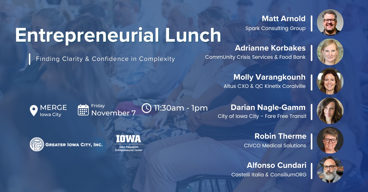Join Greater Iowa City, Inc. and the University of Iowa's John Pappajohn Entrepreneurial Center for our next Entrepreneurial Lunch!