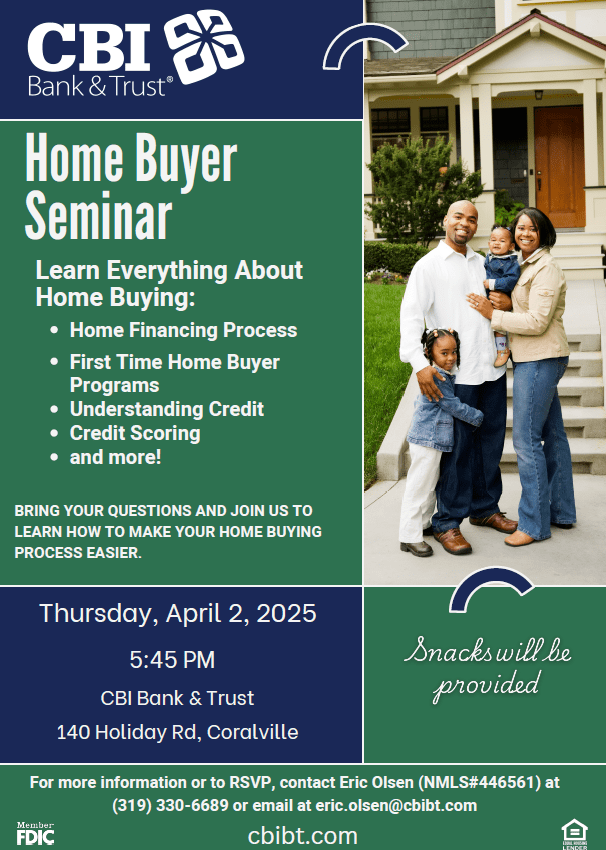 Bring your questions and join us to learn how to make your home buying process easier. Snacks will be provided! For more information or to RSVP - contact Eric Olsen at 319-330-6689 or email eric.olsen@cbibt.com.