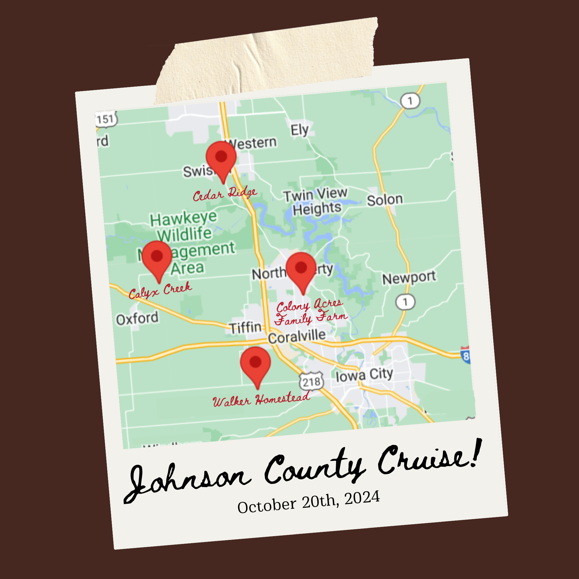 Get ready for a delightful day exploring the heart of Johnson County’s agri-tourism scene! We’re excited to invite you to a memorable county cruise featuring four fantastic stops that showcase the best of local farms, vineyards, and seasonal fun. Whether you’re a fan of fresh produce, lavender fields, fine wine, or pumpkin patches, this tour has something special for everyone. At each stop, there will be unique offerings such as tastings, samplings, experiences, or goodies given to everyone participating in the cruise, all included in the ticket price!