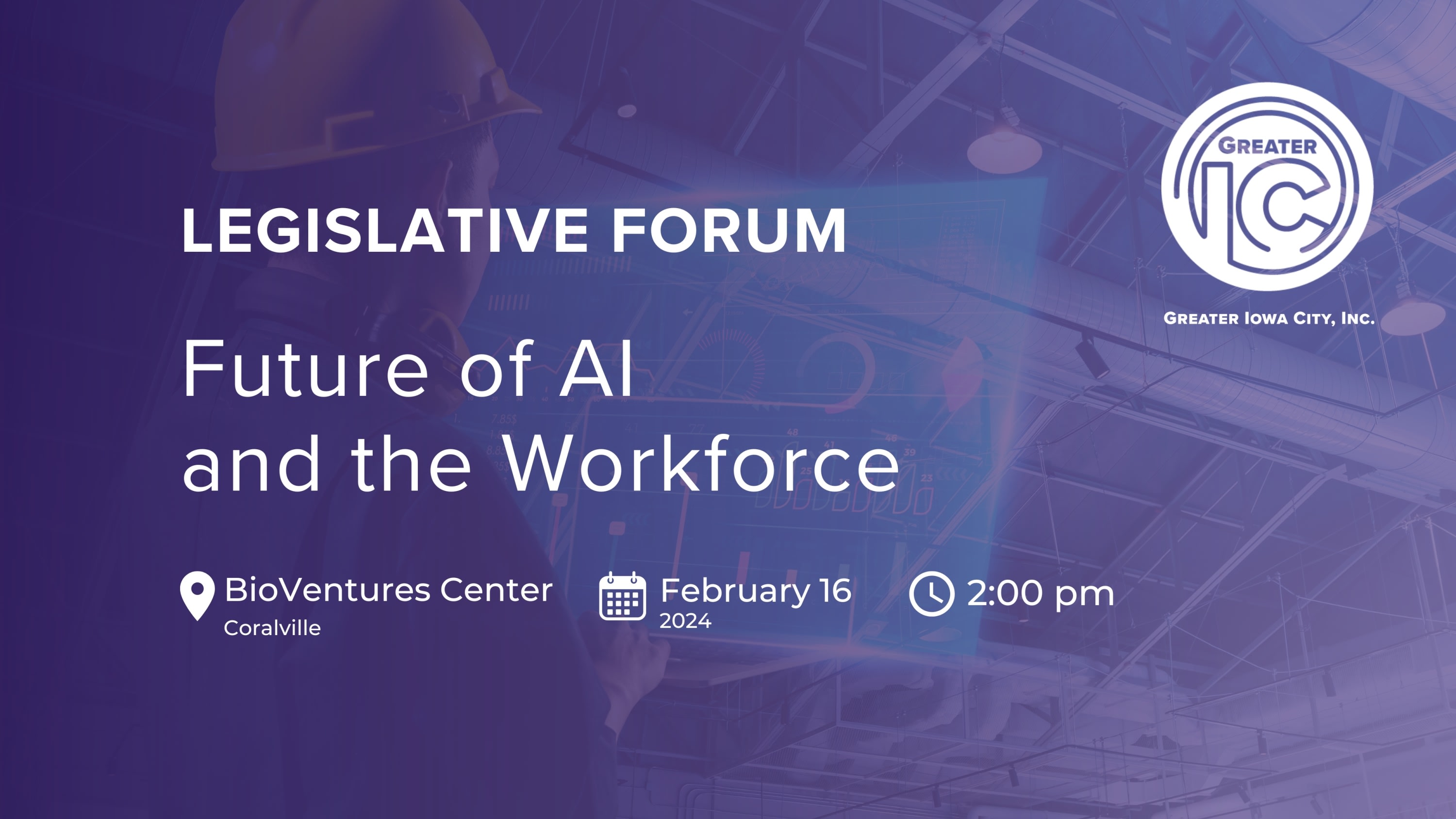 February's legislative forum will focus on the Future of AI and the Workforce. A panel of area experts will share their perspective followed by updates from legislators about relevant policy discussions happening in Des Moines.