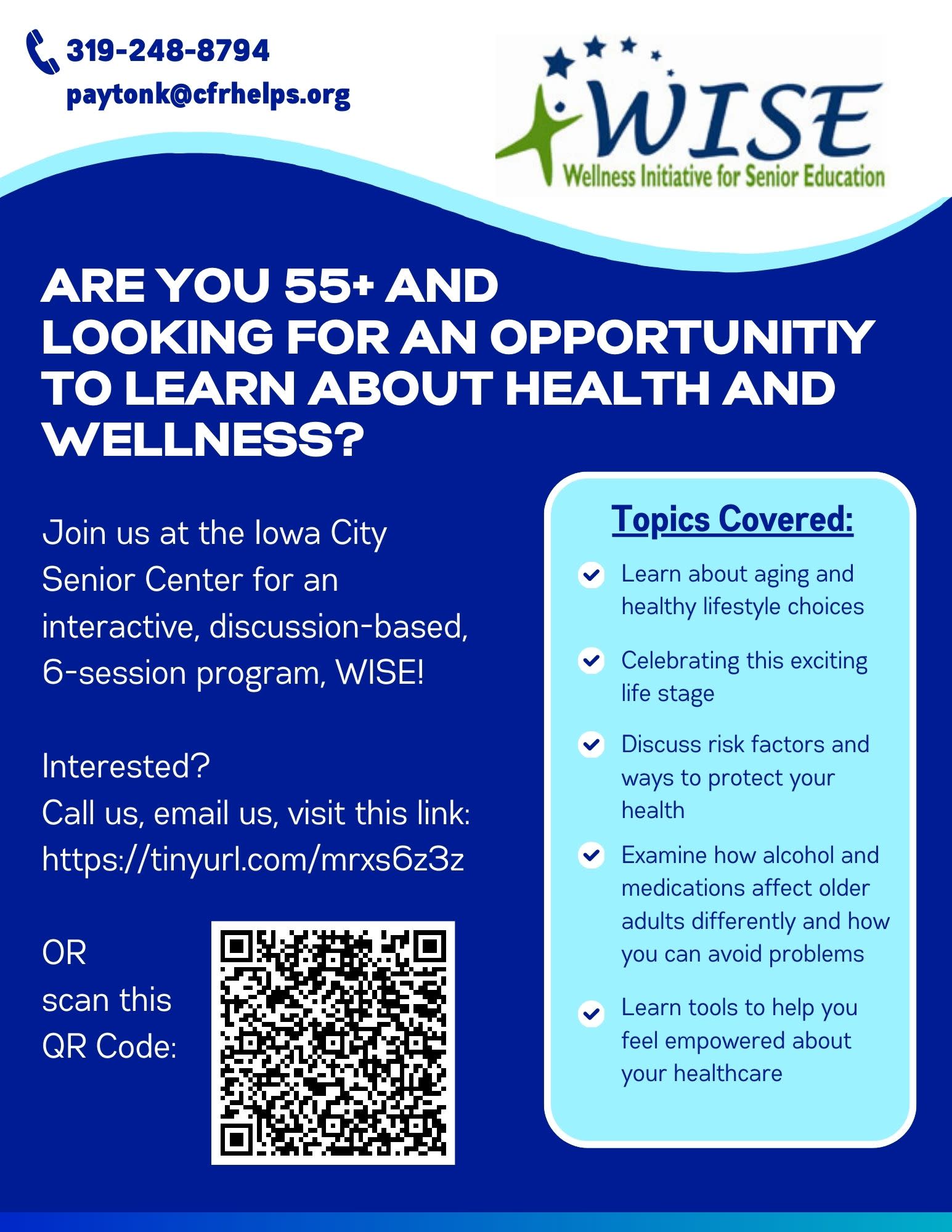 Join us at the Iowa City Senior Center for an interactive, discussion-based, 6-session program, WISE!