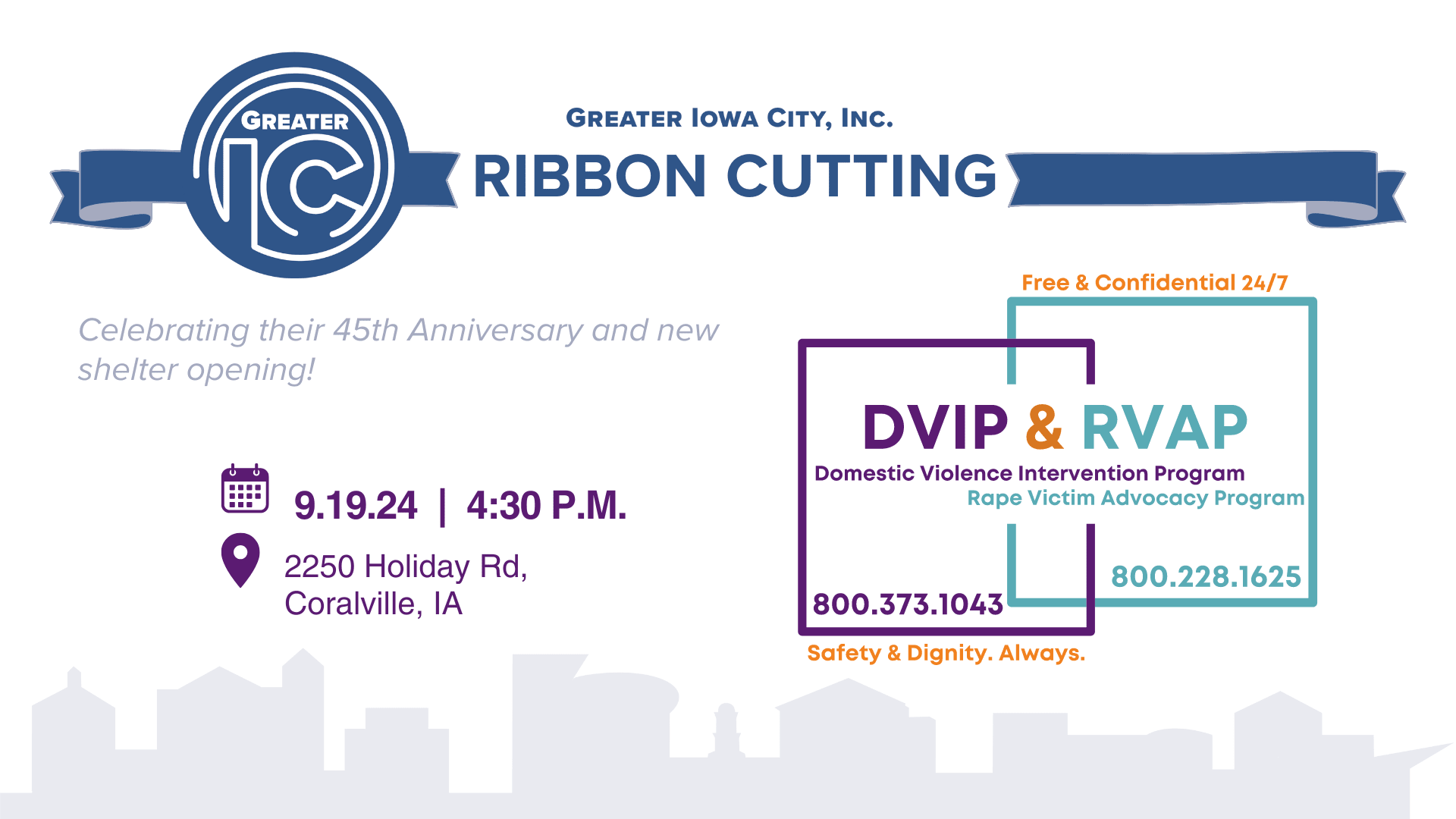 DVIP will be holding a 45th anniversary celebration following the public ribbon-cutting ceremony. It will be a ticketed event from 5 pm - 7:30 pm, at the North Ridge Pavillion in Coralville, IA.